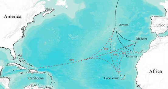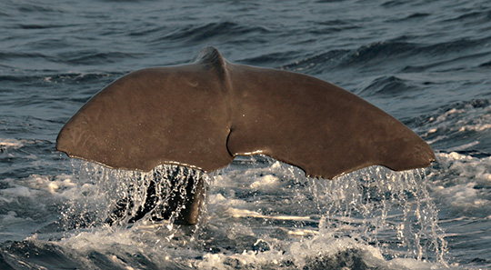 We examined the distribution of cetaceans in the waters of the Cape Verde Islands in 2000 and 2001. Sperm whales (Physeter macrocephalus), a Yankee whaling target species in these waters, were commonly detected acoustically and visually along with smaller cetacean species, predominantly in the northeast, windward quarter of the archipelago.
